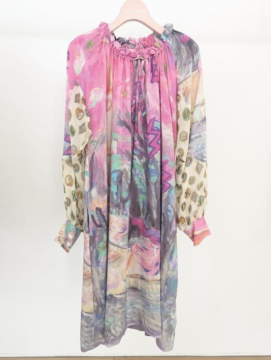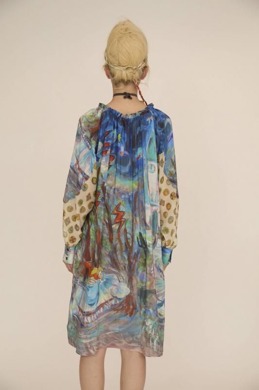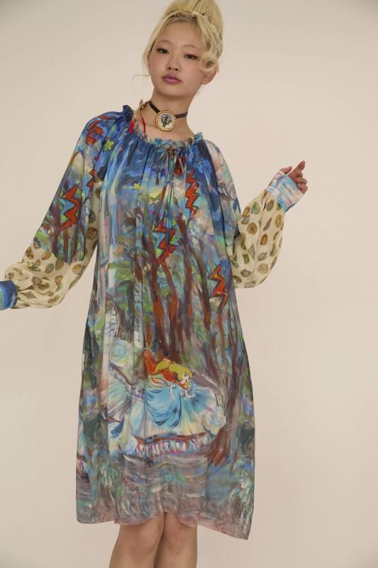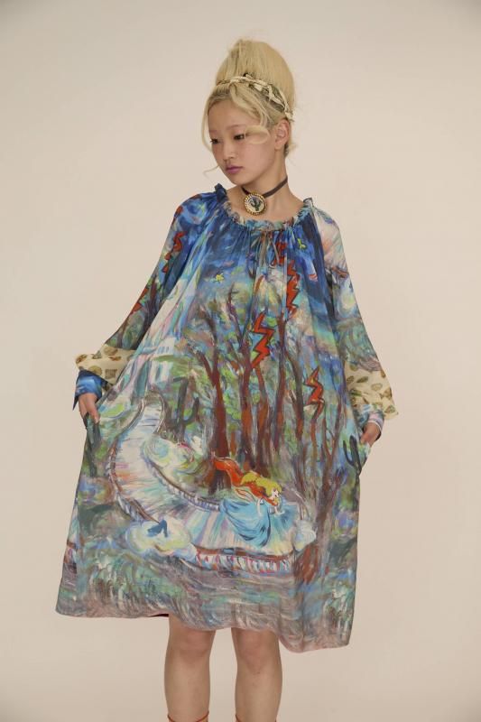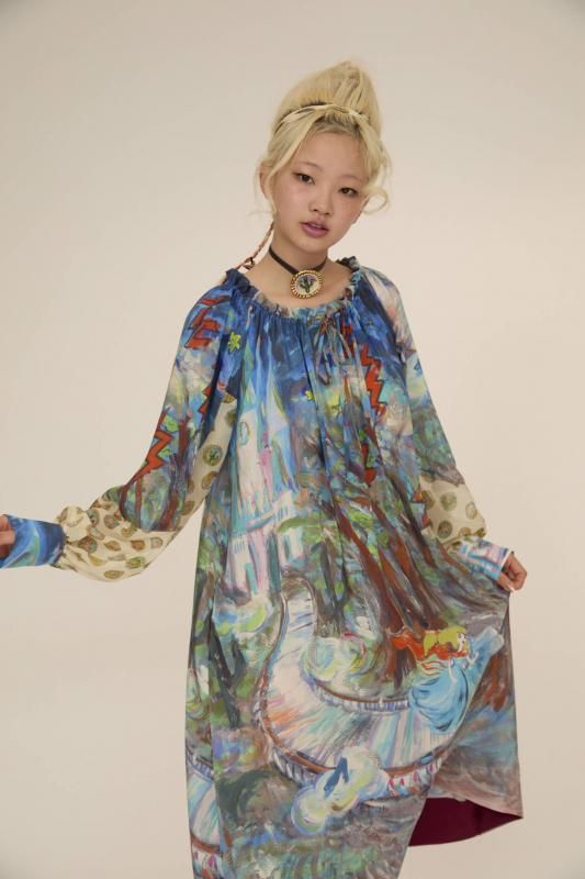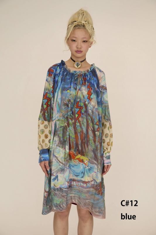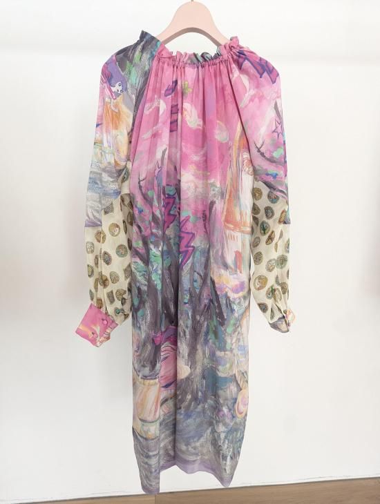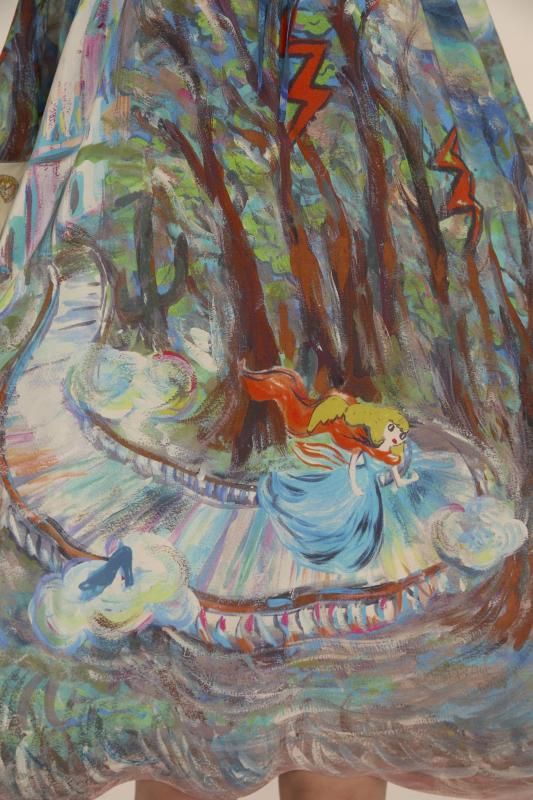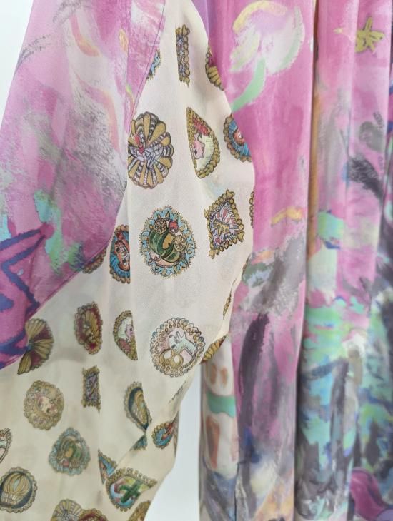 プリンセスがお城から駆け降りていく様子を自由なタッチで描き、そのままインクジェットプリントで表現しました。12時を指すお城の時計台、階段を駆け降りるプリンセス、TCの文字になっている雷、雲の上に片方のガラスの靴、踊っているような木々やサボテン、、、絵の具が混ざり合ってできた偶然の色とタッチがポイントです。 滑らかな落ち感と光沢感のあるシルクデシンに京都でインクジェットプリントをしています。