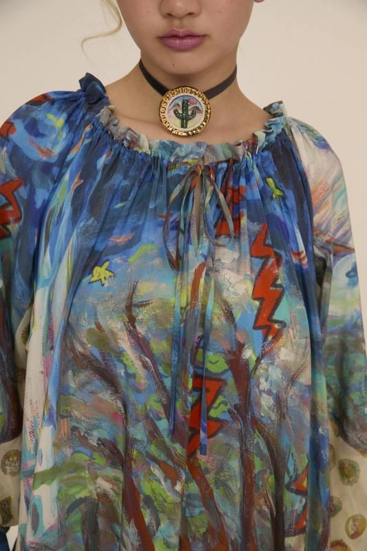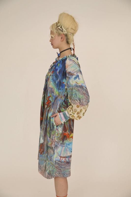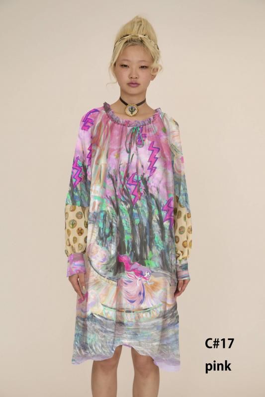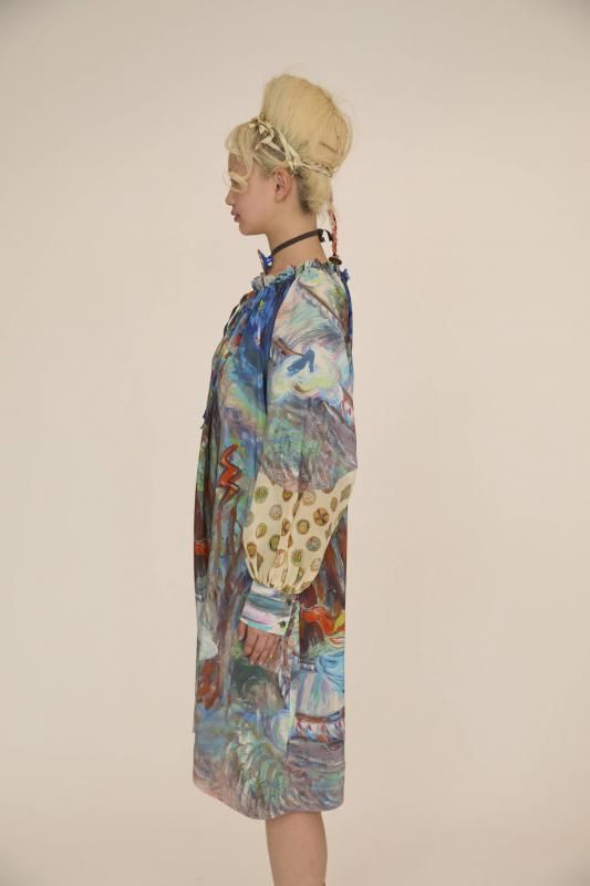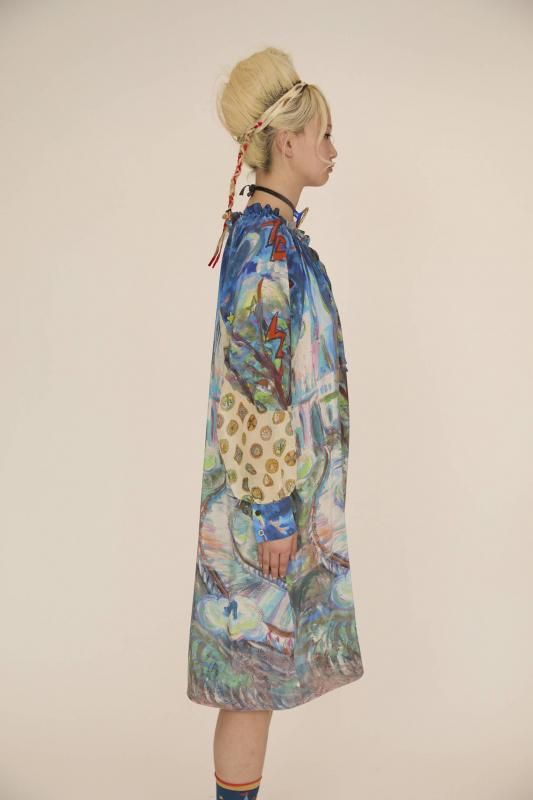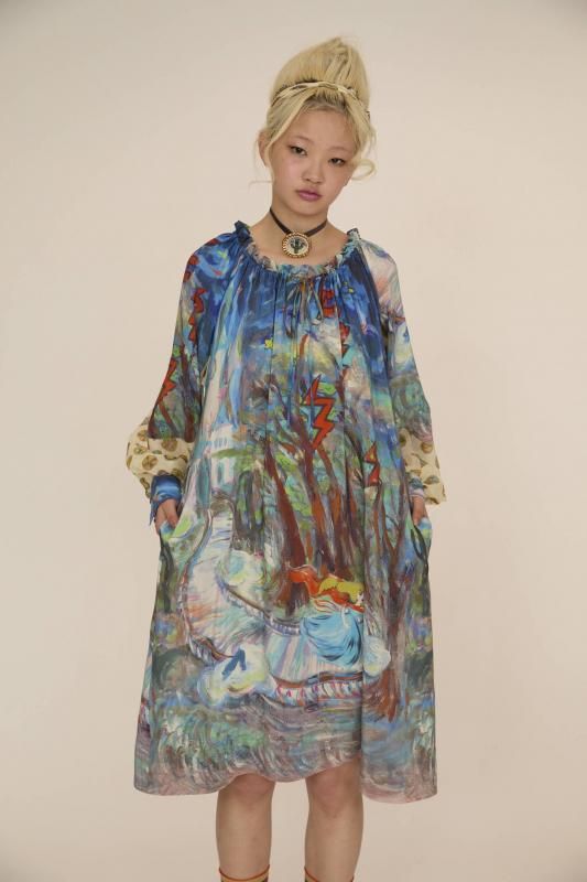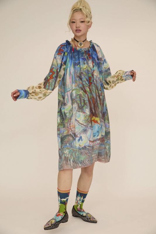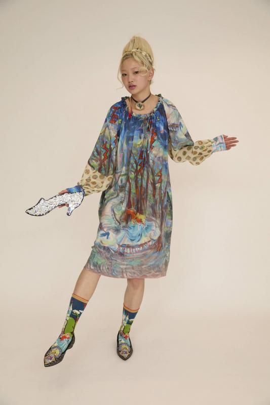 プリンセスがお城から駆け降りていく様子を自由なタッチで描き、そのままインクジェットプリントで表現しました。12時を指すお城の時計台、階段を駆け降りるプリンセス、TCの文字になっている雷、雲の上に片方のガラスの靴、踊っているような木々やサボテン、、、絵の具が混ざり合ってできた偶然の色とタッチがポイントです。 滑らかな落ち感と光沢感のあるシルクデシンに京都でインクジェットプリントをしています。