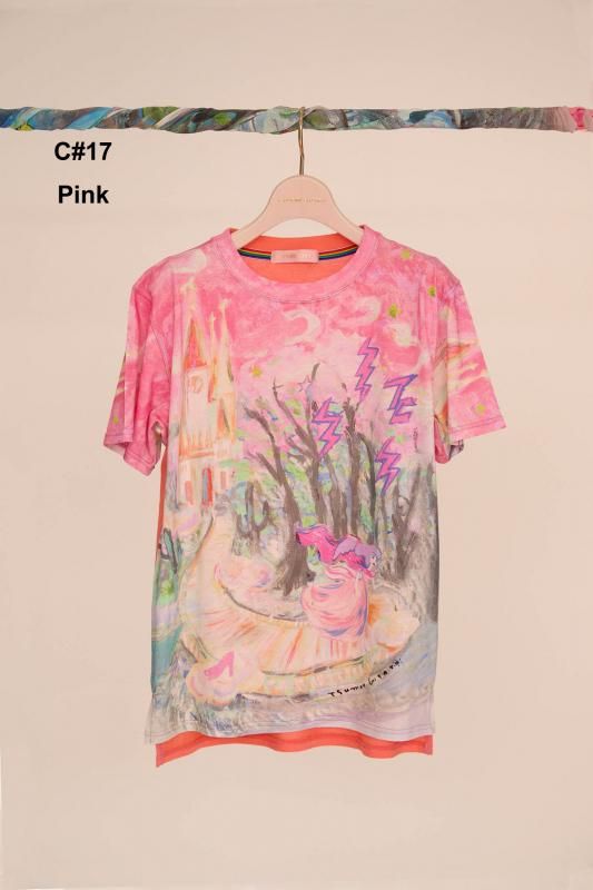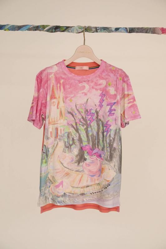 12時を指すお城の時計台、階段を駆け降りるプリンセス、TCの文字になっている雷、雲の上に片方のガラスの靴、踊っているような木々やサボテン。絵の具が混ざり合ってできた偶然の色とタッチがポイントです。